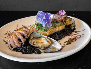 Filete de Salmon sobre una cama de Risotto en tinta de Calamar acompañado de Meiloones media concha y pulpito baby.