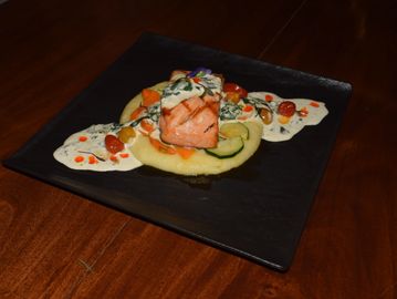 Filete de salmón sobre una cama de puré, vegetakes a la mantequlla